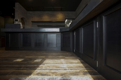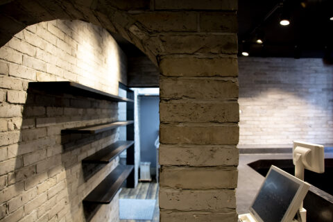 木部はブラックで引き締め、空間に重厚感をプラスしています。さらにアクセントとして選んだのが古レンガ。