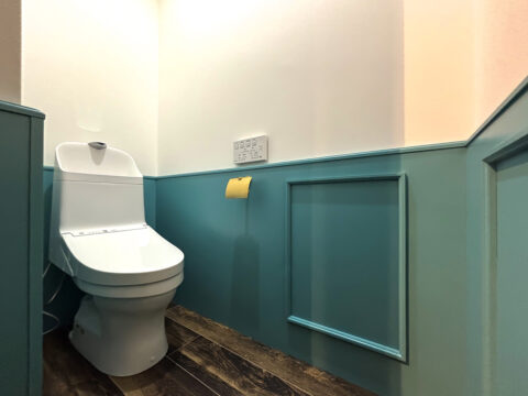 その扉を開けると、白い壁にターコイズブルーのモールディングをあしらったトイレ空間が広がります。